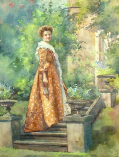 Portrait of a lady standing full-length on steps in a garden