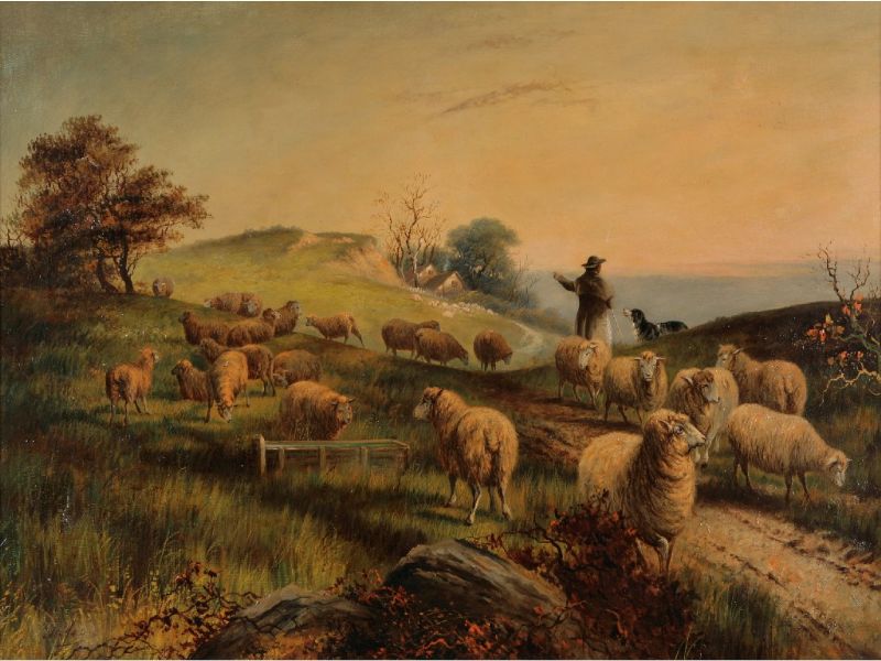 DROVING SHEEP TO PASTURE, an evening sunset landscape