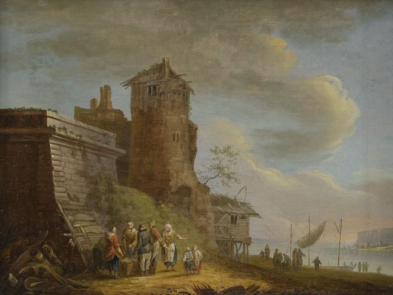 Kustlandskap med figurer vid byggnader