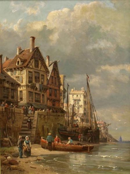 | Belebte Ansicht einer Küstenstadt mit am Strand liegenden Fischerbooten | |