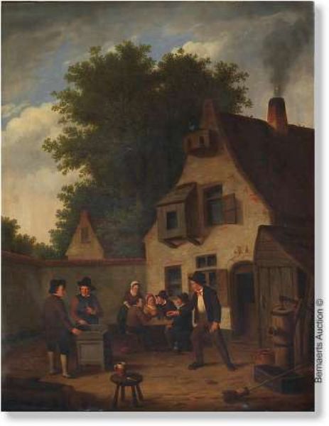 | Tavern scene in the open air with five figures at a table and three men playing a game | |