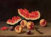 Früchtestillleben mit Melonenstücken, Pfirsichen und