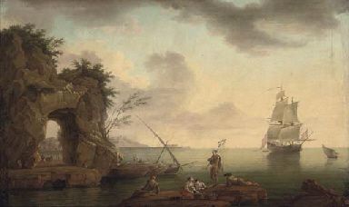 | A Mediterranean coastal inlet with shipping and fishermen on a bank | |