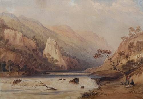 | Anglers by a rocky waterfall; figures walking by a lake | |