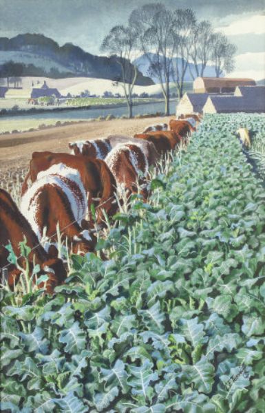 | Country Landscape with Cattle Grazing at the Edge of a Turnip Field, a Figure Nearby with a Farm and Hills Beyond | |