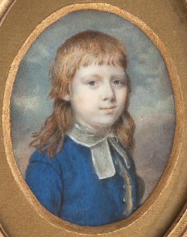 A portrait miniature of a young boy wearing a blue coat and white bands