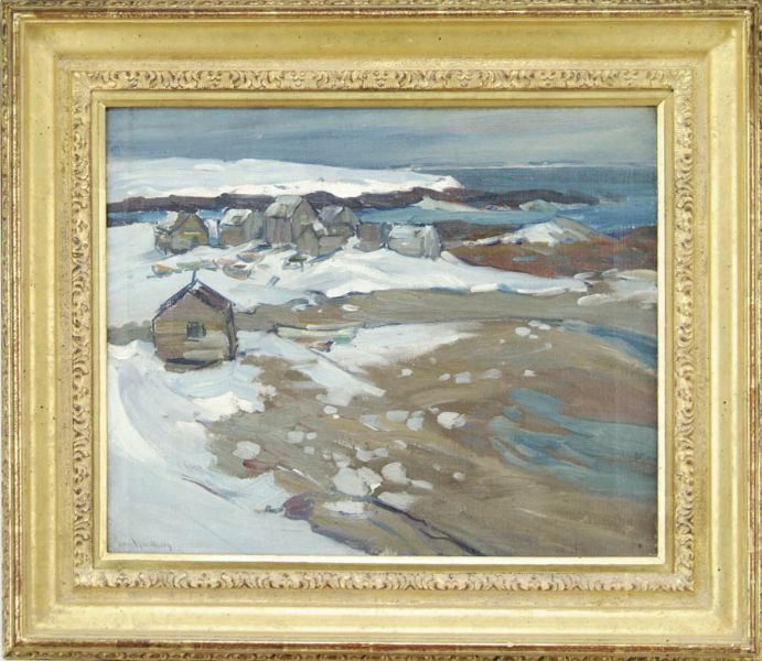 | Oil on canvas winter scene shows a coastline having several fishing and boating shacks along a rocky coastline. Several colorful skiffs are seen on shore | |