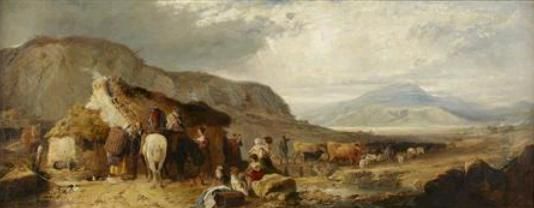 A HIGHLAND LANDSCAPE WITH FIGURES AND ANIMALS BY A COTTAGE