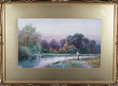 | A MOTHER AND DAUGHTER AT A RURAL FERRY-LANDING WITH A VILLAGE AND ITS CHURCH IN THE MIDDLE DISTANCE | |
