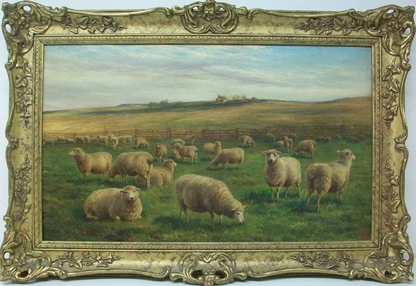 | A moorland scene with sheep to the fore and a cottage behind | |