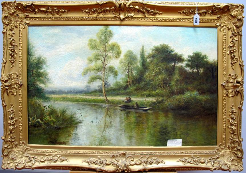| A Peaceful River Landscape, with a figure in a punt and a seated couple on the far bank | |