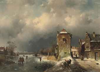 A village with skaters on a frozen waterway