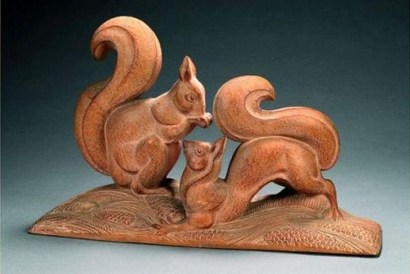 | Grand sujet en terre cuite présentant deux écureuils jouant, sur une terrasse formée de pommes et aiguilles de pins | |
