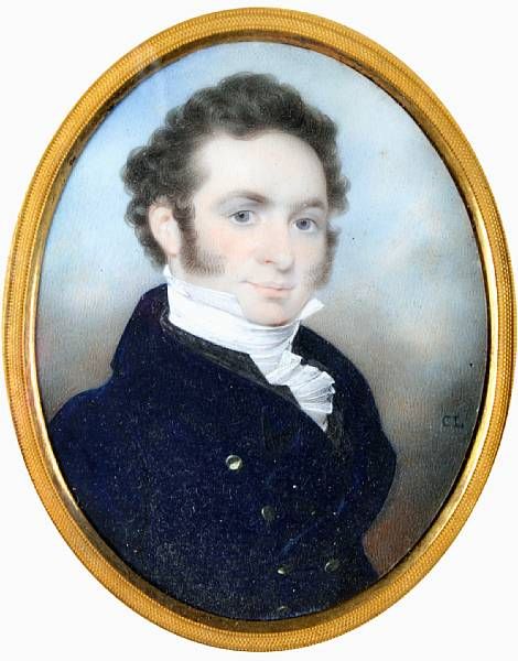 | A portrait miniature of a gentleman wearing navy blue jacket and white lace stock | |