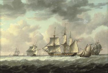 | A frigate heaving-to in the Channel amidst other ships of her squadron, with an armed cutter, probably carrying despatches or fr | |