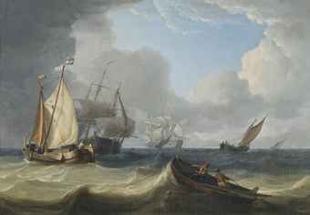 | Dutch fishing smacks and trading vessels off the coast in a heavy swell | |