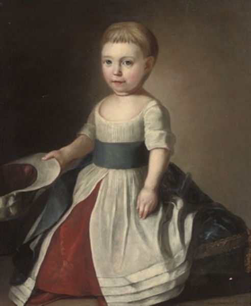 | Portrait of a young girl, full-length, in a white and red dress with a blue sash, a hat in her right hand | |