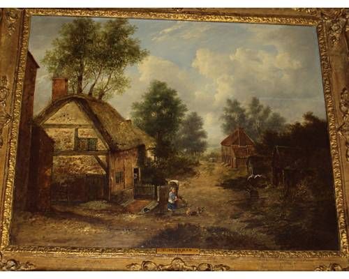 A village lane with girl feeding hens