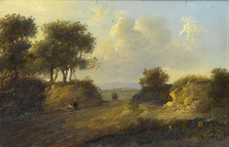 LANDSCAPE WITH TRAVELLERS; A THATCHED COTTAGE AT THE EDGE OF A WOOD