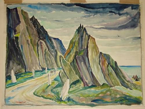 Traveller and donkey on a rocky coastal path, possibly Iceland