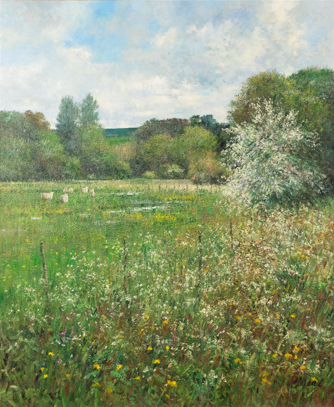 | Spring Landscape/with blossoming trees and sheep in a meadow | |