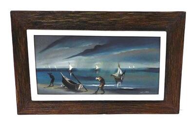 depicts figures in tones of brown and black walking along beach with boats, blue to grey background with storm in distance, signed LR, framed, not examined out of frame, minor expected wear, | |