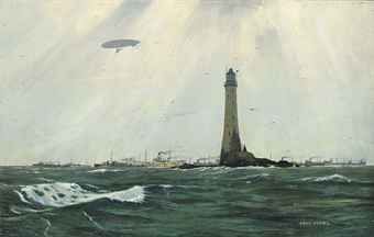 | Merchant shipping under camouflage escort in the Channel off the Wolf Rock lighthouse | |