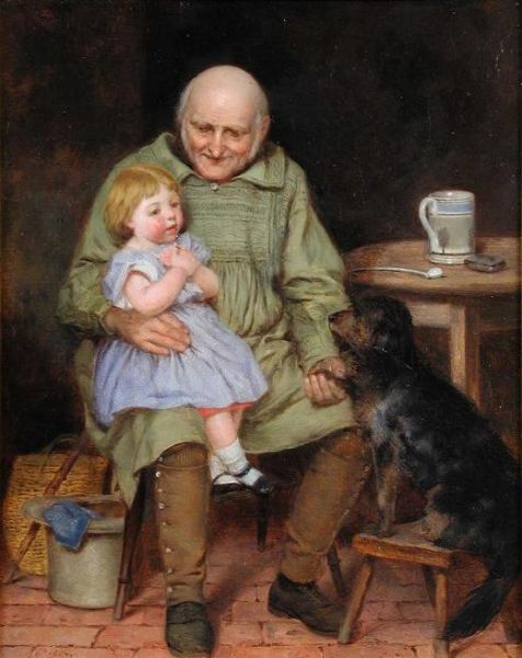 A Farmer with his Grand-daughter and their Collie in a Kitchen Interior