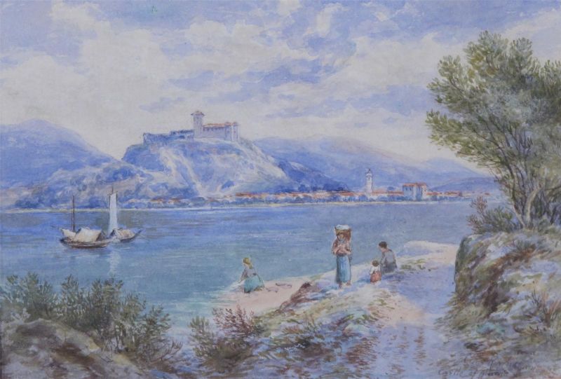 View of a lakeside town and Castle on the Italian or Swiss Lakes