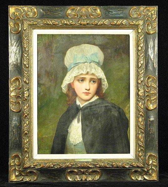 A portrait of a young girl in a lace bonnet and wearing a black cape