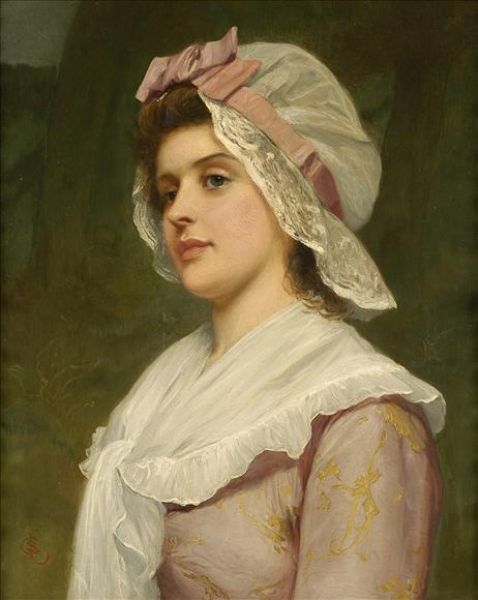 | Summer Bloom, study of a young woman, half length, wearing ribbon trimmed lace bonnet | |