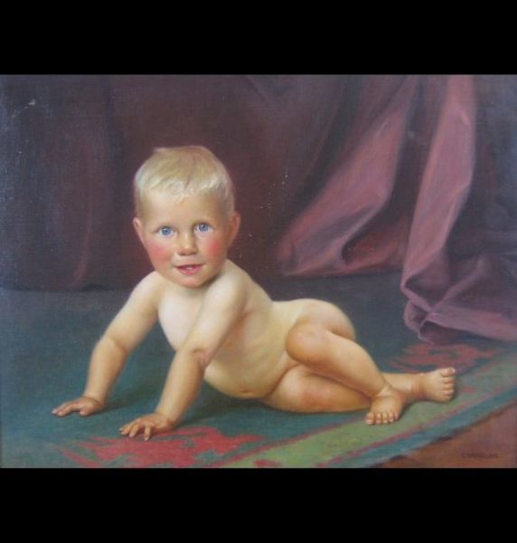 | Portrait of a baby, depicted nude on a rug with blonde hair and blue eyes | |