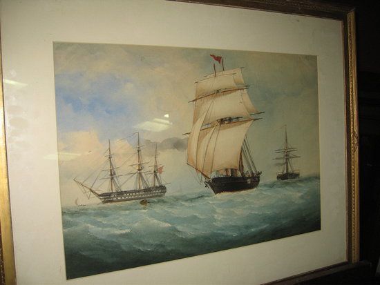 Paddle Steamer and a Square Rig Ship of the Line at Anchor