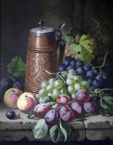Flagon and fruit on a ledge