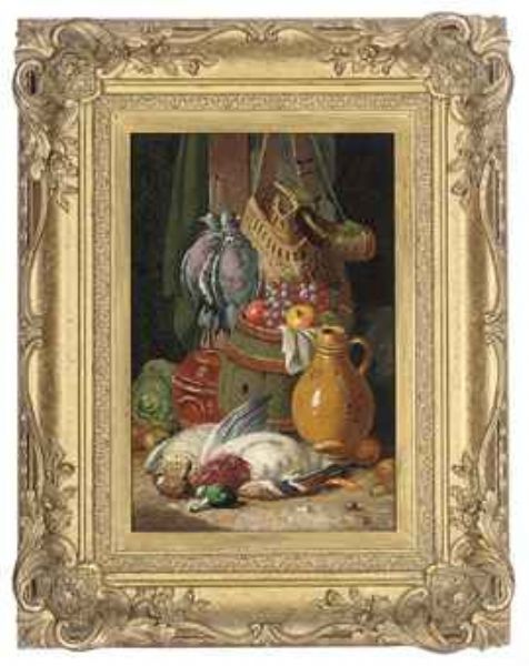 | The day's bag; and Apples, grapes, plums, a pumpkin and jug on a wooden bench | |