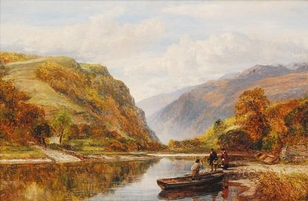 A Welsh river landscape with figures boarding a ferry