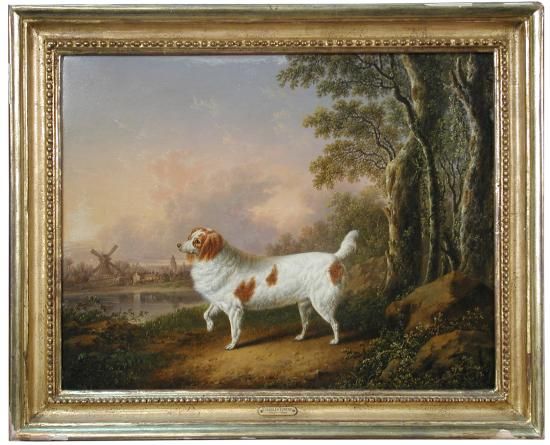 A Marlborough spaniel in a wooded landscape, a windmill beyond
