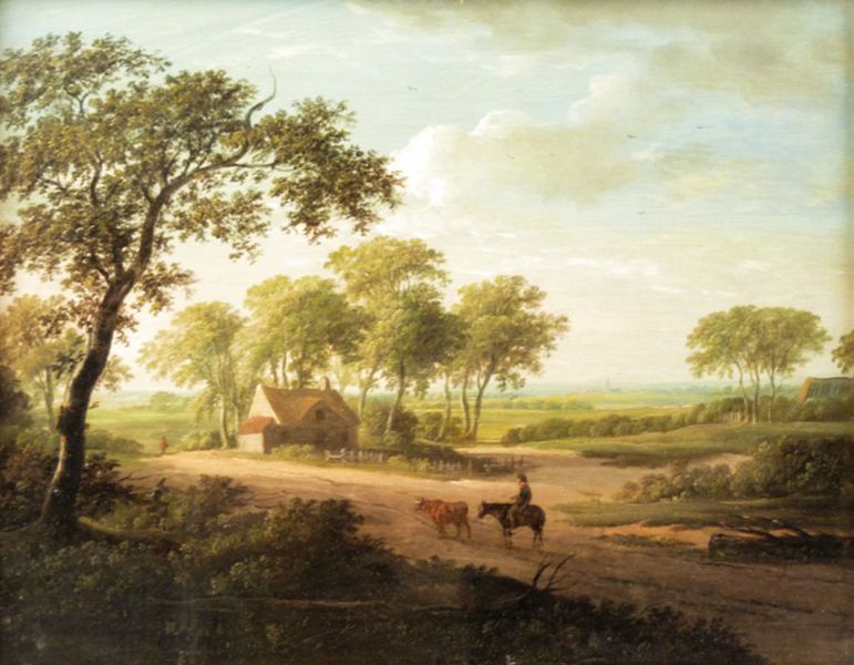 A WOODED LANDSCAPE WITH A HORSEMAN DRIVING A COW NEAR A COTTAGE