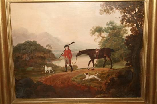 Sportsman with horse and dogs in landscape
