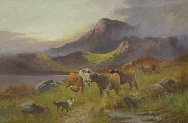 Long horn Highland cattle on a river bank, and a COMPANION with dog and cattle