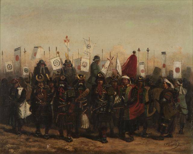 | Japanese Samurai dressed for battle with military banners and Japanese flags flying | |