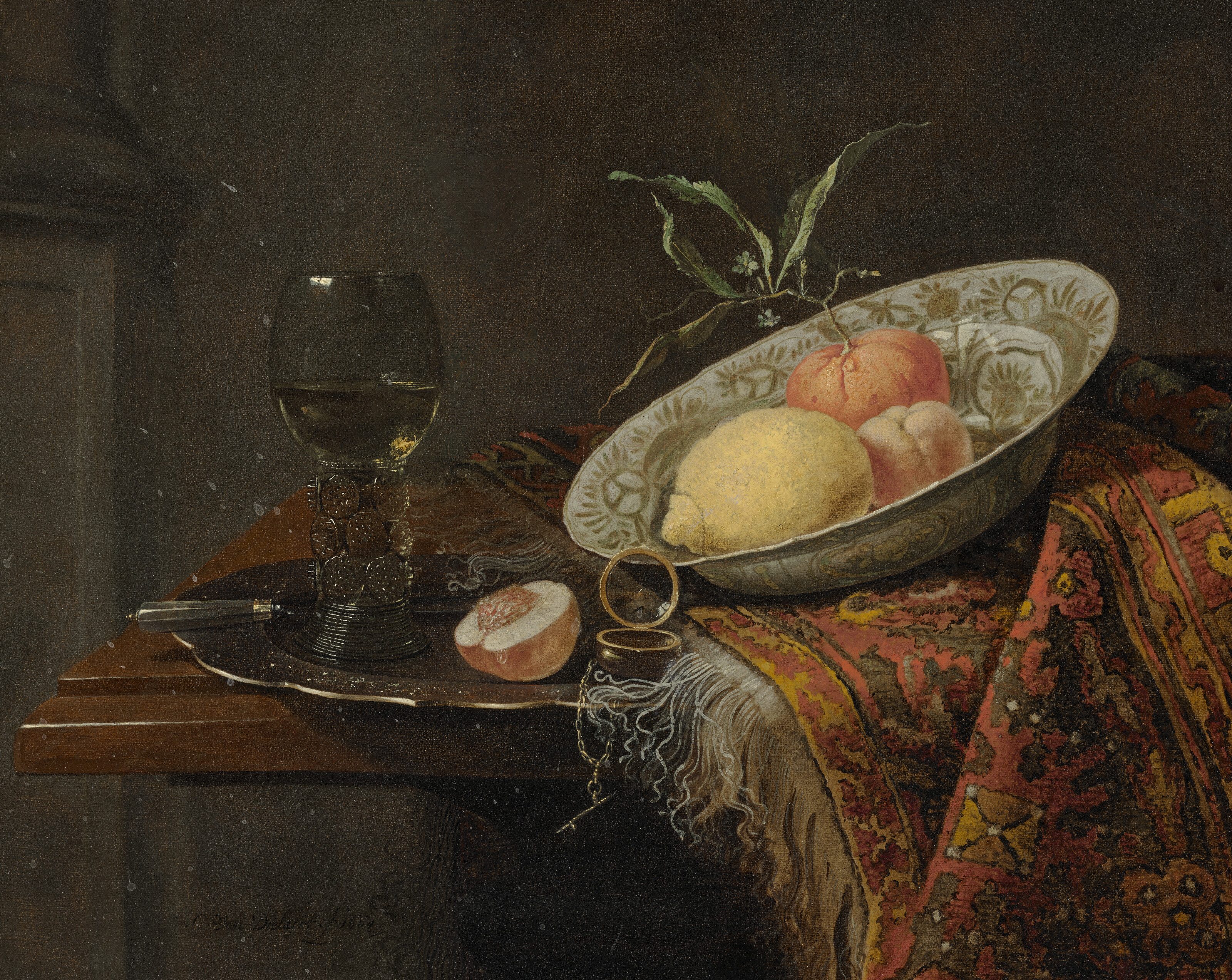 | A lemon orange and nectarine in a porcelain bowl on a rug and a roemer on a pewter platter on a table | |