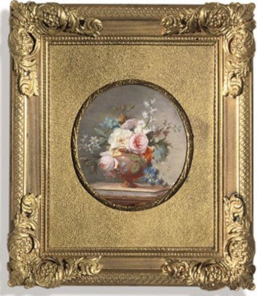 | A still-life of flowers in a vase on a stone ledge, including old roses | |
