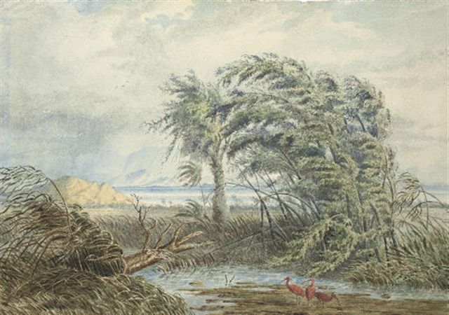 | A Venezuelan river landscape with scarlet ibis sheltering from a gale in a backwater | |