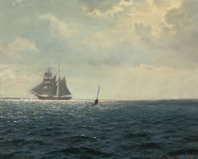 | Seascape with a sailing ship on a calm sea bathed in sunlight | |