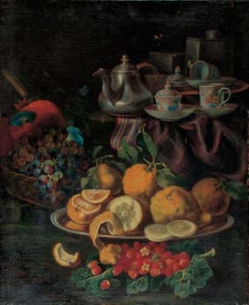 | NATURE MORTE À LA THÉIÈRE, À L’ASSIETTE DE CITRONS ET À LA COUPE DE RAISINS | |