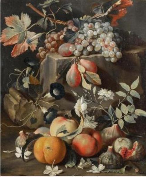 Fruit and flowers on a stone plinth