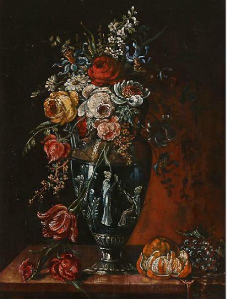 A still life with flowers in a classic vase