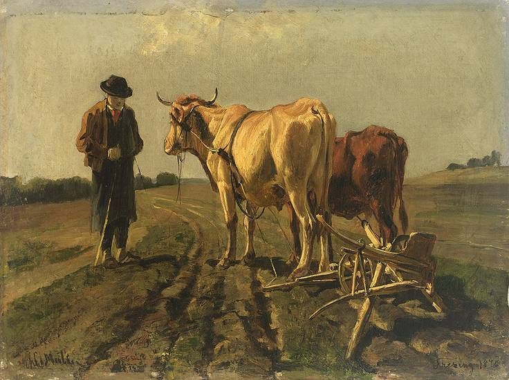 Bauer mit Ochsengespann und Pflug.