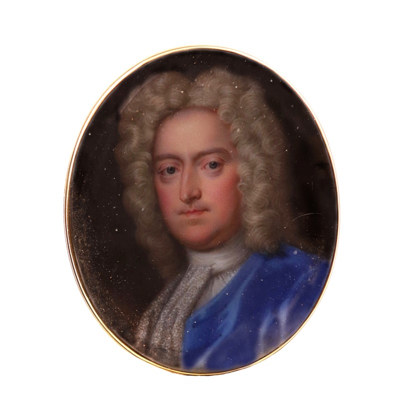 | A gentleman, bust length, in a full wig, blue coat and lace cravat | |